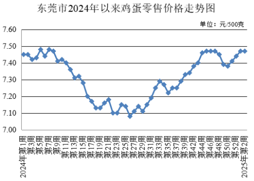 第2周,雞蛋農(nóng)貿(mào)市場零售均價(jià)為每500克7.47元,與上周持平。