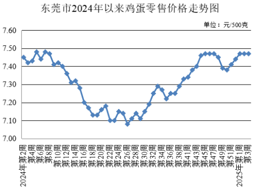 第3周,雞蛋農(nóng)貿(mào)市場零售均價(jià)為每500克7.47元,與上周持平。